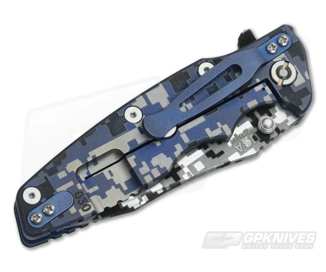The Handle: The same Gen 1 stylings you love on just a bit larger platform. The finger grooves, shape and texturing fit the hand like a glove. It’s a harmoniously ergonomic experience designed with comfort in mind. This version is dressed in black G10 secured to a titanium liner with a Battle Blue digi cam titanium frame locker on the back. All the standard Hinderer features are present from the Lockbar Stabilizer to open construction and a Ti pocket clip that can be flipped to tip up carry. #030 is engraved just below the lockbar cutout.