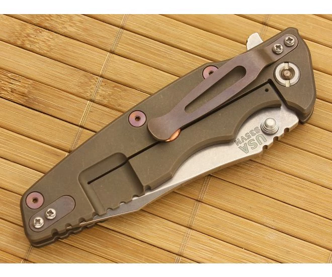The Handle: Full titanium frame lock and liner have a Battle Bronze Finish. Bronze titanium Hardware and Standoffs create one tough package while 3D texturing on the G-10 scale coupled with jimping all around create a solid grip. Two finger grooves really complete the grip on this package. This Hinderer Eklipse includes the famous Hinderer Lockbar Stabilizer and two-position Battle Bronze titanium clip for tip up or down right hand carry.