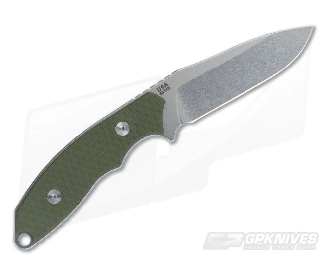 The Handle: Two slabs of OD green G10 with familiar Hinderer texturing are just the right size. Not too thick and bulky to keep the weight down on the overall slim design. They’re cut slightly smaller to leave the ergonomic tang exposed ending in a lanyard hole end. Finger grooves are comfortable in the forward and reverse grip with a small choil keeping the digits safe behind the edge.