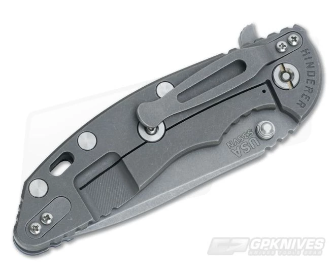 The Handle: Full titanium frame lock and liner have a Working Finish. This finish utilizes Hinderer’s darkest, worn-in appearance. It’s one tough battle-tested finish that will hide the hardest use. Hardware and standoffs create one tough package while 3D texturing on the G-10 scale coupled with jimping all around create a solid grip. There is a bit of a choil to choke up on the blade for more detailed cutting tasks as well. This Hinderer XM-18 includes the famous Hinderer Lockbar Stabilizer and two-position titanium clip for tip up or down right hand carry.