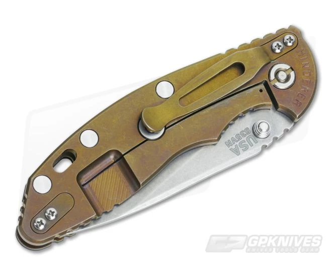 The Handle: Full titanium frame lock and liner have a Battle Bronze finish. This finish utilizes Hinderer’s stonewashing technique with a pop of Bronze anodization. It’s one tough battle-tested finish that will last. Hardware and standoffs create one tough package while 3D texturing on the G-10 scale coupled with jimping all around create a solid grip. There is a bit of a choil to choke up on the blade for more detailed cutting tasks as well. This Hinderer XM-18 includes the famous Hinderer Lockbar Stabilizer and two-position Battle Bronze titanium clip and insert for tip up or down right hand carry.