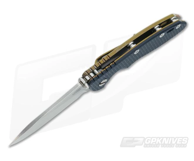 The Blade: The three and a half inch blade is stonewashed and can be opened via dual thumb studs/blade stops. Rick’s own 17-4PH state-of-the-art pivot system creates silky smooth ambidextrous operation. This is a non-flipper model that opens quite easily and efficiently via its studs. The Slicer grind comes shaving sharp out of the box.