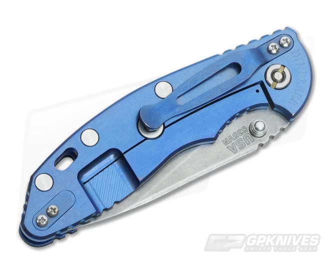 The Handle: Full titanium frame lock and liner have a Battle Blue finish. This finish utilizes Hinderer’s stonewashing technique with a pop of Blue anodization. It’s one tough battle-tested finish that will last. Hardware and standoffs create one tough package while 3D texturing on the G-10 scale coupled with jimping all around create a solid grip. There is a bit of a choil to choke up on the blade for more detailed cutting tasks as well. This Hinderer XM-18 includes the famous Hinderer Lockbar Stabilizer and two-position Battle Blue titanium clip and insert for tip up or down right hand carry.