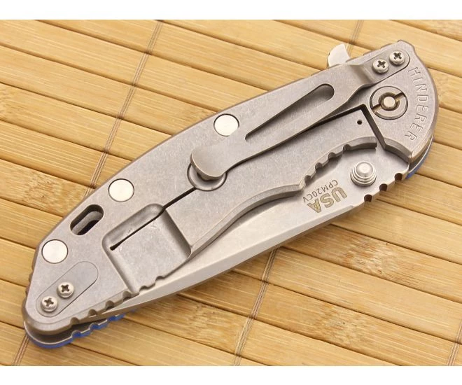 Hinderer Knives XM-18 3.5″ Gen IV Spear Point Flipper in Blue 3D textured G10 is a precision-crafted hard-use tactical folder. The XM-18 sports a 3.5″ CPM-20CV powder steel spear point styled blade with a tumbled/stonewash finish and laser engraved logos. Rick’s own 17-4PH state-of-the-art pivot system and dual thumb stud/flipper deployment create silky smooth operation. Precision CNC machined tumbled titanium lockside featuring the patented Hinderer Lockbar Stabilizer to prevent over-extension of the lock. A reversible tumbled titanium pocket clip is attached for tip-down or up carry. This XM-18 3.5″ Spear Point is brand new direct from Hinderer Knives.