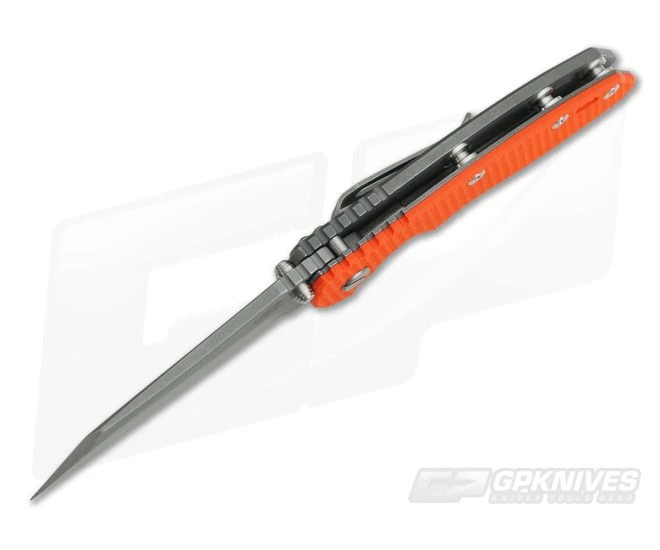 The Handle: Full titanium frame lock and liner have a matching Working Finish that is rugged and hides wear well while reducing reflectivity. Satin Hardware and standoffs create one solid package while 3D texturing on the Orange G10 scale coupled with jimping all around create a solid grip. There is also a bit of a choil to choke up on the blade for more detailed cutting tasks as well. This Hinderer XM-18 includes the famous Hinderer Lockbar Stabilizer and two-position Working Finish titanium clip and insert for tip up or down right hand carry.