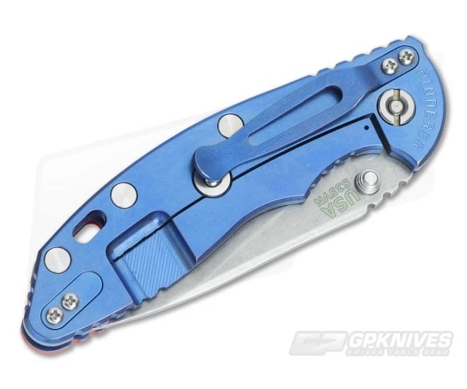 The Handle: Full titanium frame lock and liner have a Battle Blue finish. This finish utilizes Hinderer’s stonewashing technique with a pop of Blue anodization. It’s one tough battle-tested finish that will last. Hardware and standoffs create one tough package while 3D texturing on the G-10 scale coupled with jimping all around create a solid grip. There is a bit of a choil to choke up on the blade for more detailed cutting tasks as well. This Hinderer XM-18 includes the famous Hinderer Lockbar Stabilizer and two-position Battle Blue titanium clip and insert for tip up or down right hand carry.