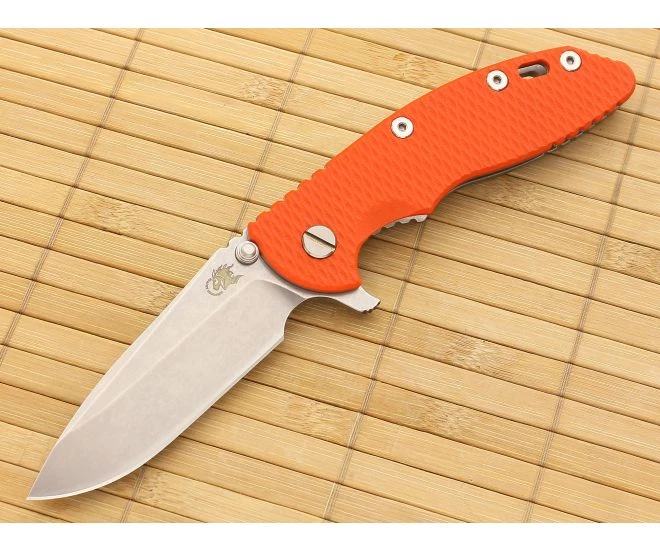 Hinderer Knives XM-18 3.5″ Gen IV Spear Point Flipper in Orange 3D textured G10 is a precision-crafted hard-use tactical folder. The XM-18 sports a 3.5″ CPM-20CV powder steel spear point styled blade with a tumbled/stonewash finish and laser engraved logos. Rick’s own 17-4PH state-of-the-art pivot system and dual thumb stud/flipper deployment create silky smooth operation. Precision CNC machined tumbled titanium lockside featuring the patented Hinderer Lockbar Stabilizer to prevent over-extension of the lock. A reversible tumbled titanium pocket clip is attached for tip-down or up carry. This XM-18 3.5″ Spear Point is brand new direct from Hinderer Knives.