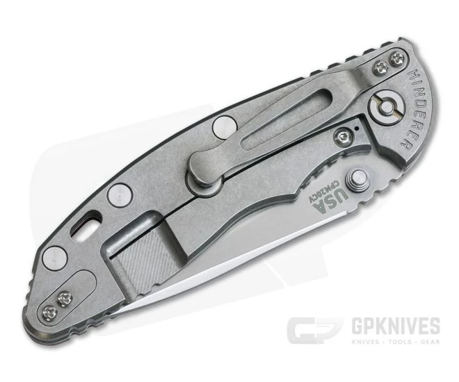 Handle: Full titanium frame lock and liner have a worn-in Stonewashed finish. This finish offers a nice clean look that hides wear and can be customized with anodization. Hardware and standoffs create one tough package while 3D texturing on the G10 front scale coupled with jimping all around create a solid grip. There is a bit of a choil to choke up on the blade for more detailed cutting tasks as well. The XM-18 includes the iconic Hinderer Lockbar Stabilizer for added security.