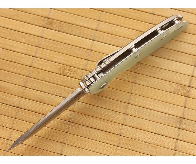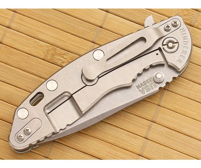 The Handle: Full titanium frame lock and liner have a heavily tumbled finish. Hardware and standoffs create one tough package while 3D texturing on the G-10 scale coupled with jimping all around create a solid grip. There is a bit of a choil to choke up on the blade for more detailed cutting tasks as well. This Hinderer XM-18 includes the famous Hinderer Lockbar Stabilizer and two-position titanium clip and insert for tip up or down right hand carry.