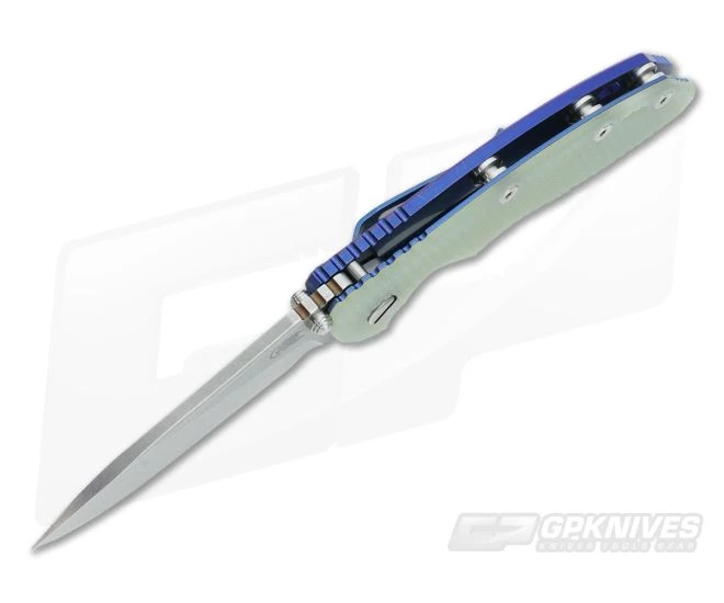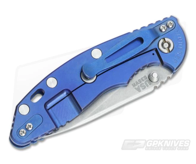 The Handle: Full titanium frame lock and liner have a Battle Blue finish. This finish utilizes Hinderer’s stonewashing technique with a pop of Blue anodization. It’s one tough battle-tested finish that will last. Hardware and standoffs create one tough package while 3D texturing on the G-10 scale coupled with jimping all around create a solid grip. There is a bit of a choil to choke up on the blade for more detailed cutting tasks as well. This Hinderer XM-18 includes the famous Hinderer Lockbar Stabilizer and two-position Battle Blue titanium clip and insert for tip up or down right hand carry.