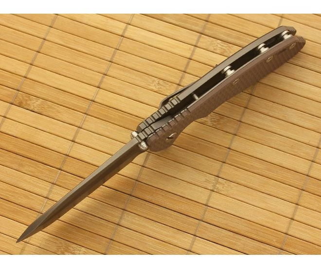The Handle: This knife has a dark earth brown G10 front scale with an Anthracite DLC titanium liner lying beneath. The rear side is solid CNC machined DLC titanium with hefty jimping and a frame lock. Hinderer’s famous lock bar stabilizer or LBS is present, and a reversible DLC tip up or down carry clip/filler tab is attached. The XM-24 has open spine construction via barrel spacers for easy cleaning/maintenance.