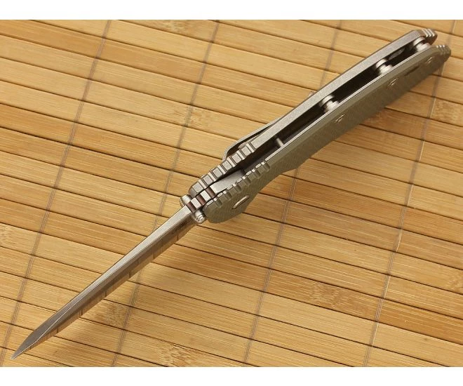 The Handle: This knife has an OD Green G10 front scale, with a titanium liner lying beneath. The rear side is solid CNC machined titanium with hefty jimping and a frame lock. Hinderer’s famous lock bar stabilizer or LBS is present, and a reversible tip up or down carry clip is attached. The XM-24 has open spine construction via barrel spacers and will provide years of guild free use thanks to its fully tumbled frame.
