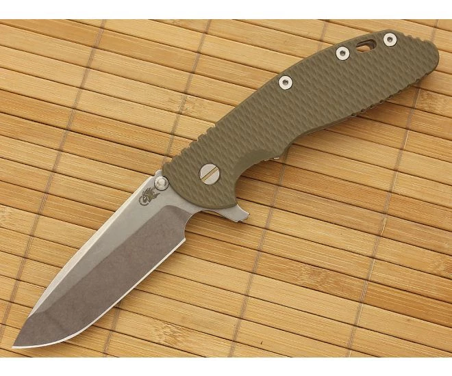 The Hinderer XM-24 is the largest knife in the series of XM knives. It was specifically designed for those with larger hands or for use when wearing gloves. Ease of opening and closing one-handed combined with a reliable lock system were also primary considerations, all met within the 24. This version of the knife has a tumbled finish, spanto blade with flipper and OD Green G10 handle scales.