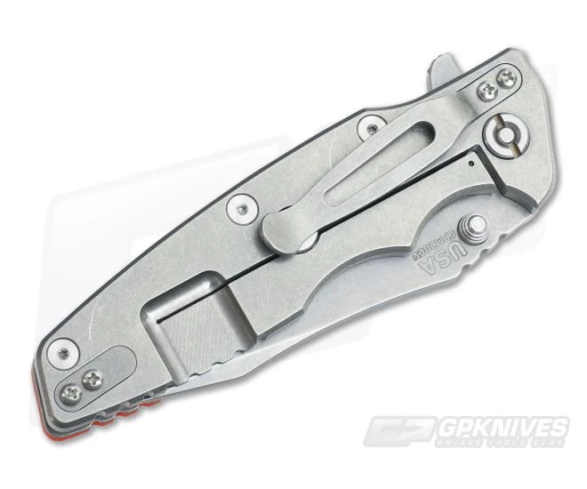 The Handle: The same Gen 1 stylings you love on just a bit larger platform. The finger grooves, shape and texturing fit the hand like a glove. It’s a harmoniously ergonomic experience designed with comfort in mind. This version is dressed in orange G10 secured to a titanium liner with a Stonewashed titanium frame locker on the back. All the standard Hinderer features are present from the Lockbar Stabilizer to open construction and a Ti pocket clip that can be flipped to tip up carry.