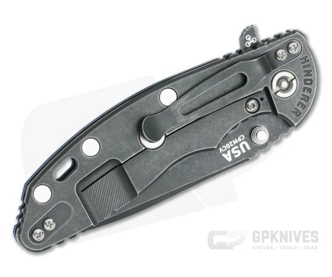 Handle: Full titanium frame lock and liner have a matching “Battle Black” finish that is rugged and hides wear well while still having a handsome appeal. Satin Hardware and Black DLC standoffs create one solid package while 3D texturing on the G10 scale coupled with jimping all around create a solid grip. There is also a bit of a choil to choke up on the blade for more detailed cutting tasks as well. This Hinderer XM-18 includes the famous Hinderer Lockbar Stabilizer and two-position titanium clip and insert for tip up or down right-hand carry.