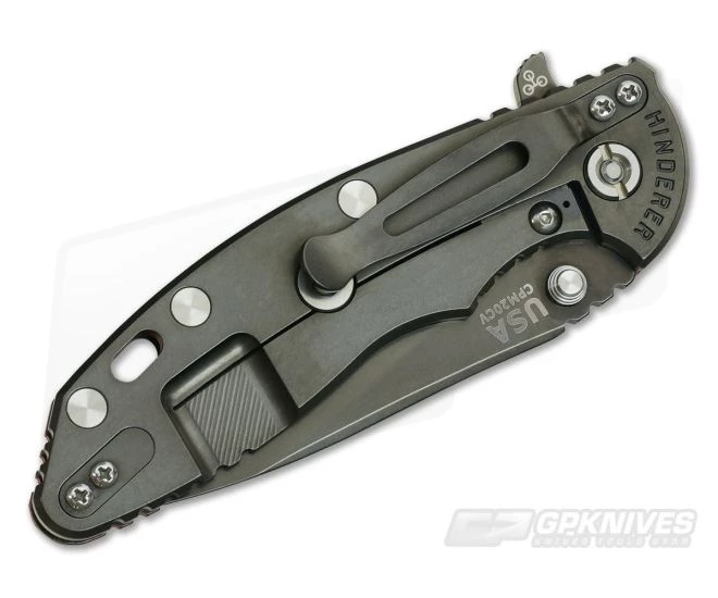 Handle: Full titanium frame lock and liner have a matching tumbled black DLC that is rugged and hides wear well while still having a handsome appeal. Satin Hardware and standoffs create one solid package while 3D texturing on the G10 scale coupled with jimping all around create a solid grip. There is also a bit of a choil to choke up on the blade for more detailed cutting tasks as well. This Hinderer XM-18 includes the famous Hinderer Lockbar Stabilizer and two-position titanium clip and insert for tip up or down right hand carry.