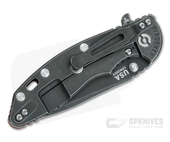 Handle: Full titanium frame lock and liner have a matching “Battle Black” finish that is rugged and hides wear well while still having a handsome appeal. Satin Hardware and Black DLC standoffs create one solid package while 3D texturing on the G10 scale coupled with jimping all around create a solid grip. There is also a bit of a choil to choke up on the blade for more detailed cutting tasks as well. This Hinderer XM-18 includes the famous Hinderer Lockbar Stabilizer and two-position titanium clip and insert for tip up or down right-hand carry.