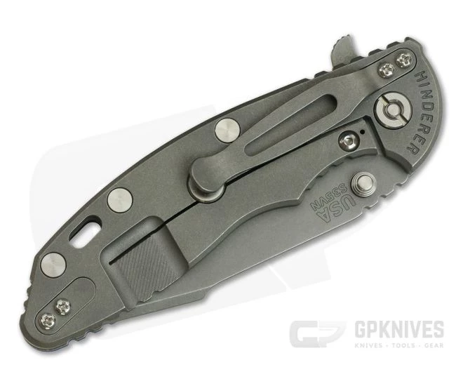 Handle: Full titanium frame lock and liner have a matching Working Finish that is rugged while still having a handsome appeal. Satin Hardware and standoffs create one solid package while 3D texturing on the G10 scale coupled with jimping all around create a solid grip. There is also a bit of a choil to choke up on the blade for more detailed cutting tasks as well. This Hinderer XM-18 includes the famous Hinderer Lockbar Stabilizer and two-position titanium clip and insert for tip up or down right hand carry.
