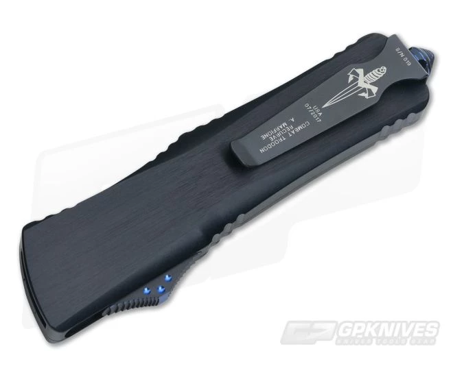 Marfione Custom Combat Troodon Interceptor out the front automatic knife is a substantial tool, popular among military, law enforcement and first responders. This knife is slender enough to keep on your person daily while the Mirror Polish blade appeals directly to collectors. The Troodon is named after a bird-like dinosaur from the Campanian Age and is ready to strike.