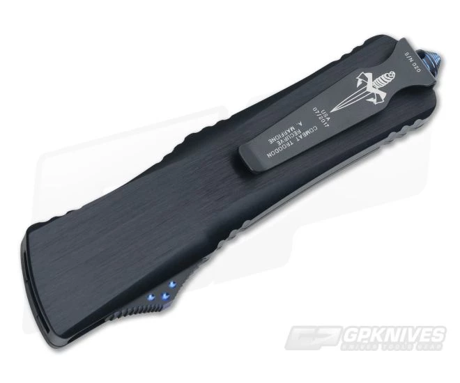 The Handle:Robust anodized alloy offers 5.25 inches of handle, excluding the breaker, substantial enough for even the largest or gloved hands. It has a smooth, clean feel with sections of wide jimping perfectly placed for a secure grip. It is built with Microtech’s proprietary blue ringed hardware, integrated glass breaker end and black pocket clip. The clip features the Customs dagger, USA 07/2017, model with maker and Serial #020.