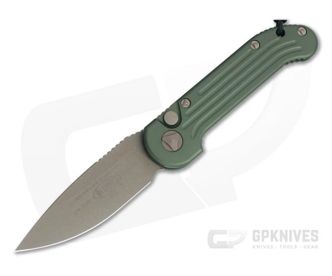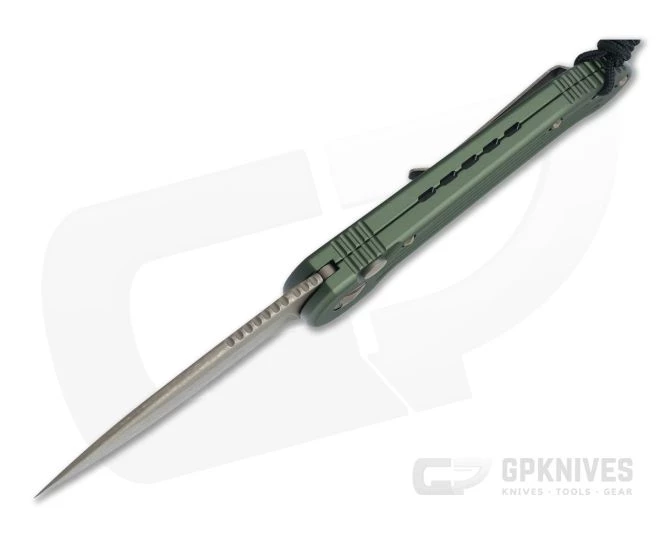 The L.U.D.T. (Large Underwater Demolition Team) out the side automatic knife model from Microtech has been a favorite among Spec Ops and first responders for nearly 20 years. This version features an Apocalyptic Bronzed drop point, Elmax blade and a grooved OD Green aircraft grade aluminum handle.