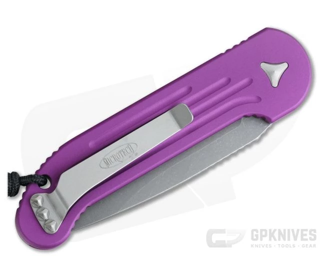 The L.U.D.T. (Large Underwater Demolition Team) out the side automatic knife model from Microtech has been a favorite among Spec Ops and first responders for nearly 20 years. This version features a straightforward drop point blade in Microtech’s Apocalyptic finished Bohler M390 with a partially serrated edge and grooved, Violet anodized, aircraft grade aluminum handle.