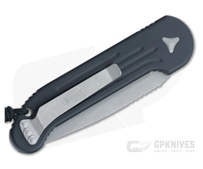 The L.U.D.T. (Large Underwater Demolition Team) out the side automatic knife model from Microtech has been a favorite among Spec Ops and first responders for nearly 20 years. This version features a partially serrated, drop point blade in rugged Apocalyptic finished Elmax and a grooved Black anodized aircraft grade aluminum handle.