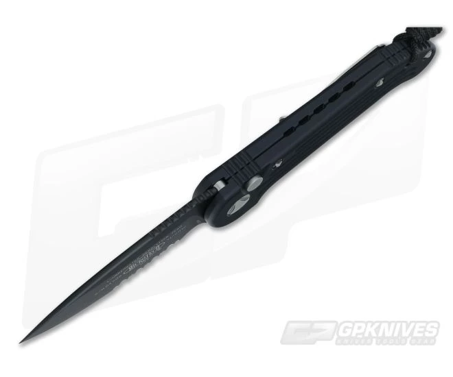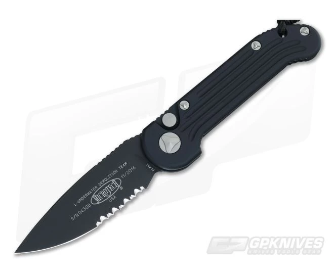 The L.U.D.T. (Large Underwater Demolition Team) out the side automatic knife model from Microtech has been a favorite among Spec Ops and first responders for nearly 20 years. This version features a black partially serrated drop point blade and a grooved black aircraft grade aluminum handle.
