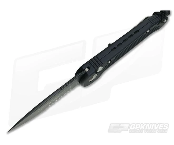 The L.U.D.T. (Large Underwater Demolition Team) out the side automatic knife model from Microtech has been a favorite among Spec Ops and first responders for nearly 20 years. This version features a black partially serrated drop point blade and a grooved black aircraft grade aluminum handle.