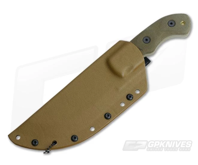 The Handle: Very simple, yet very effective green canvas micarta handle scales are cut the same as white liners beneath them and bolted to the full tang design. This material is comfortable and maintains its grip rain or shine. The #2 fills the hand completely and comfortably for a nice, ergonomic grip on a medium to large sized cutting tool. A small brass lanyard tube is inserted near the end.